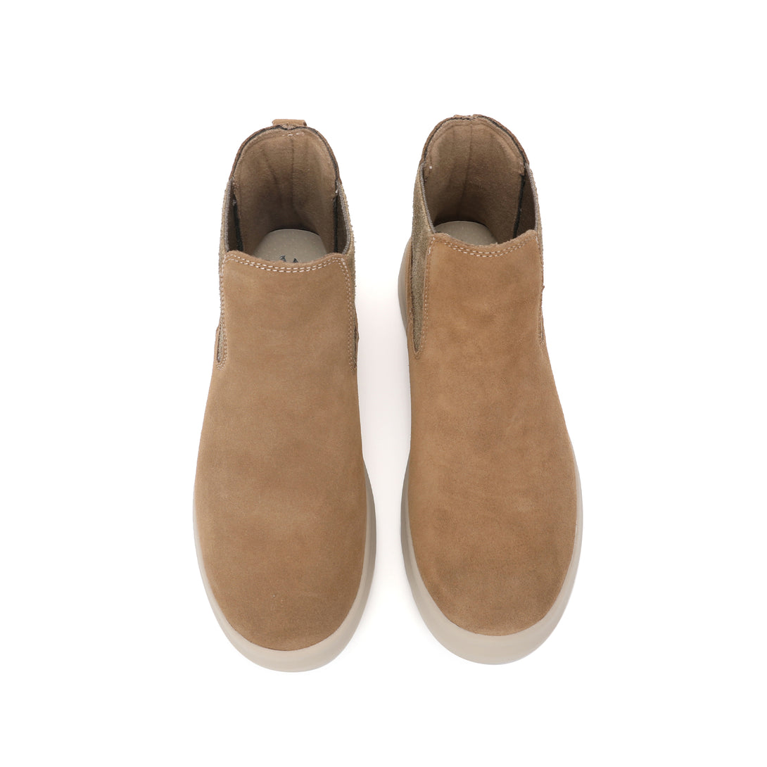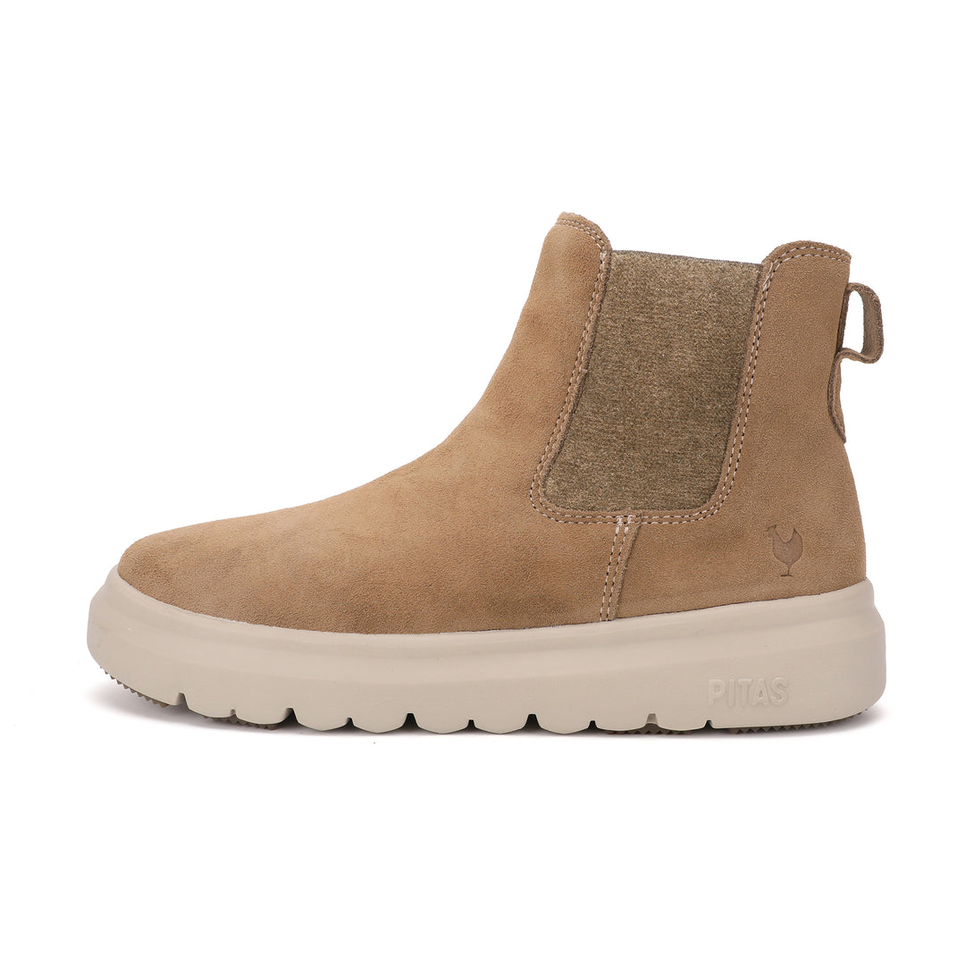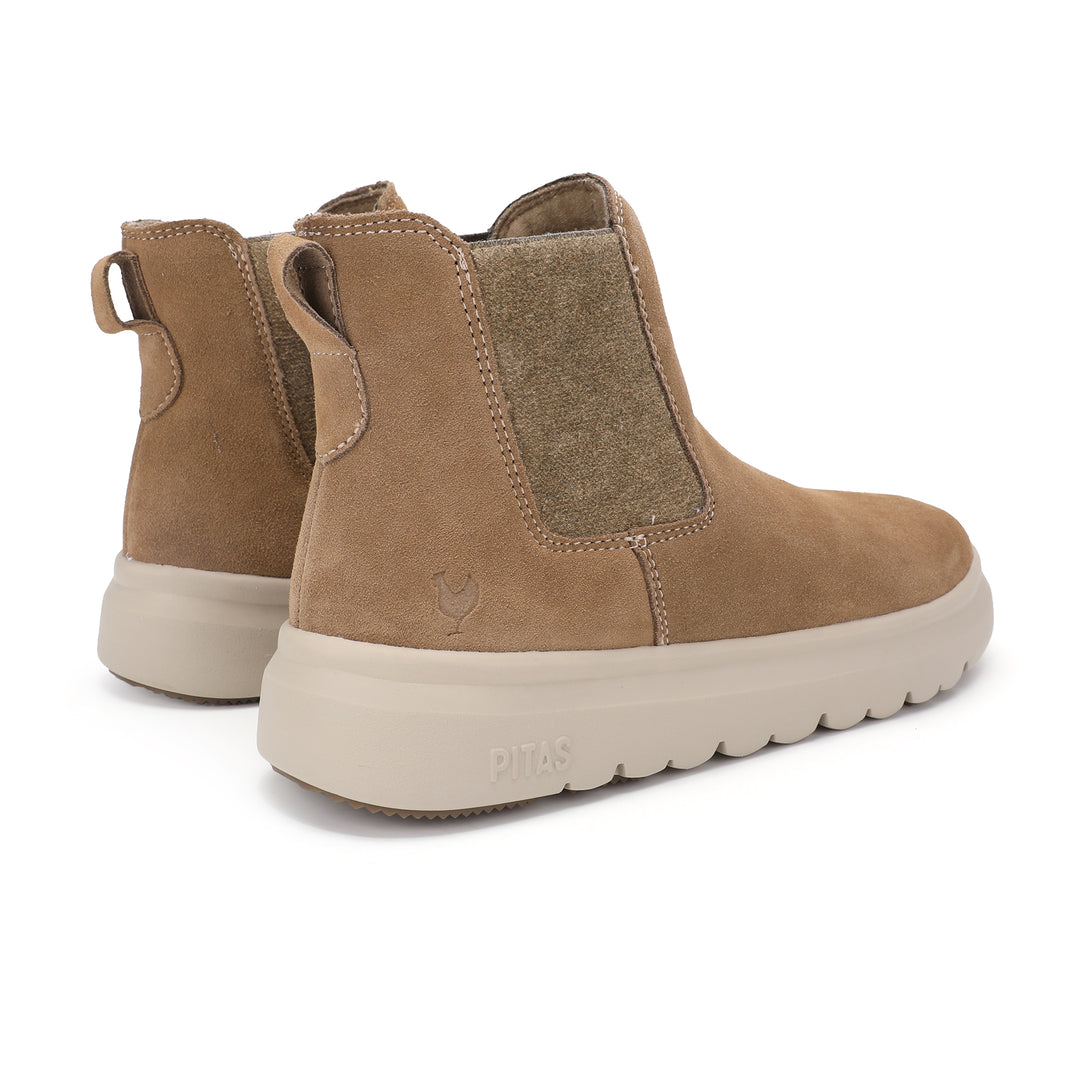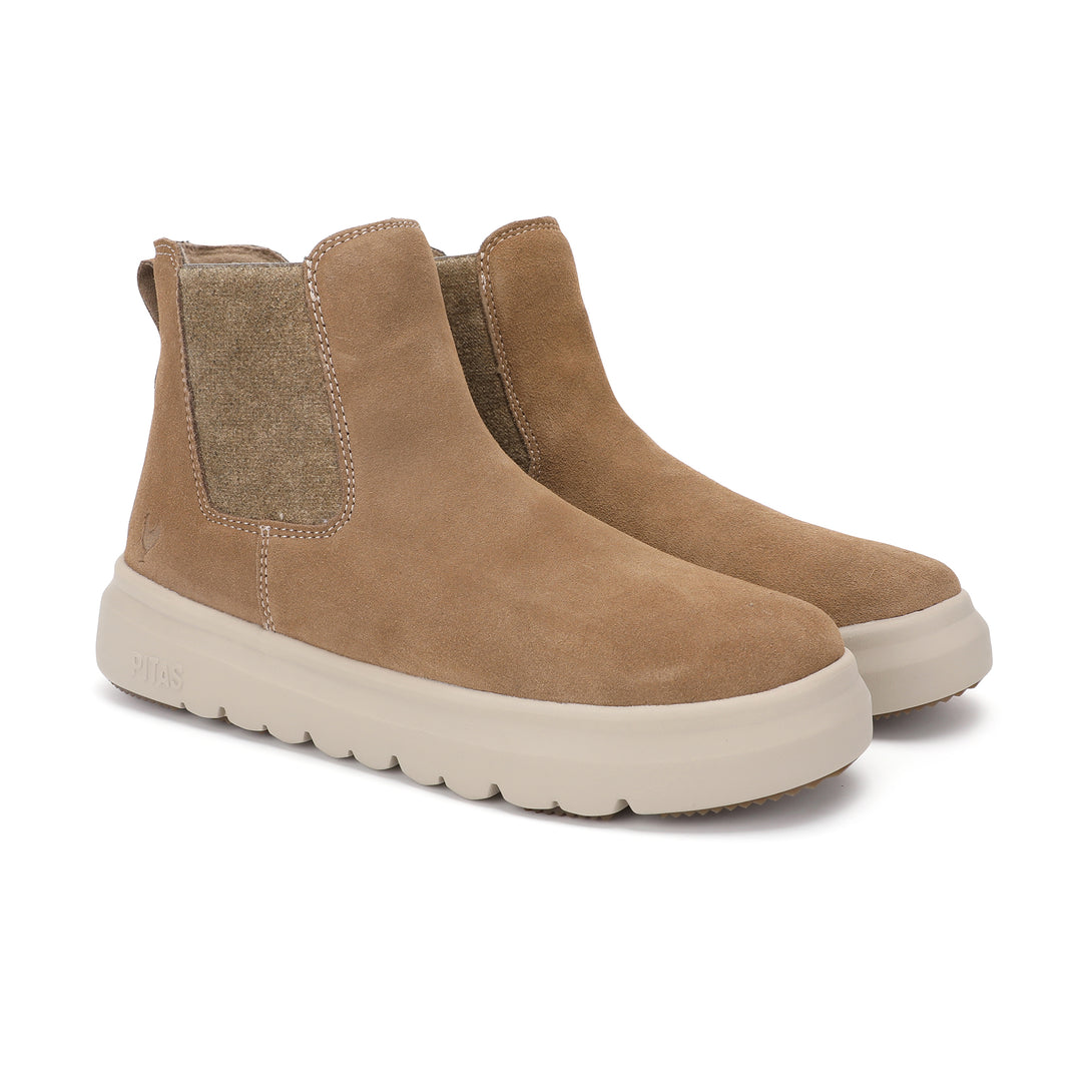 La bota Nantes en color camel de mujer es una bota tipo chelsea diseñada para ofrecer estilo, comodidad y versatilidad en el día a día. Su corte en serraje hidrofugado repele el agua y aporta un look elegante y urbano. Puntera redonda y elásticos laterales que facilitan el calzado y su caña baja característicos. Son perfectas para combinar con cualquier outfit de invierno.